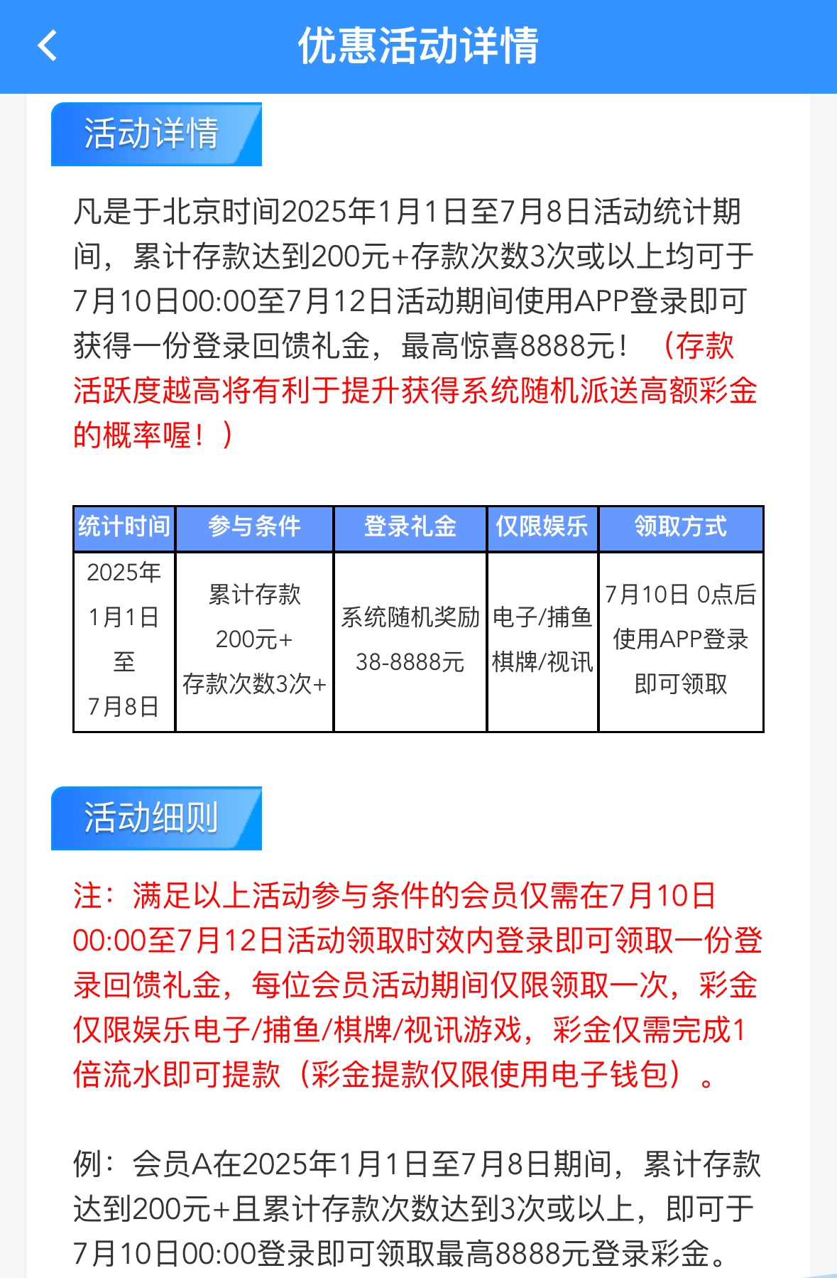 2025年1月1日至7月8日活动统计期间,累计存款达到200元+存款次数3次或以上均可于7月10日00:00至7月12日活动期间使用APP登录即可获得一份登录回馈礼金